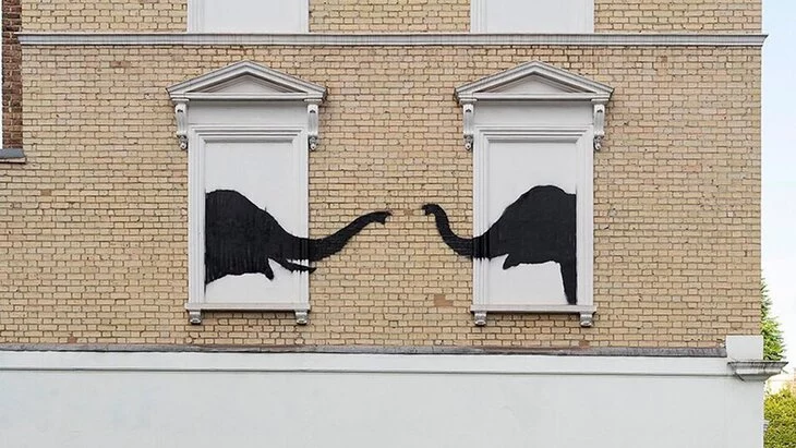 Новое граффити появилось на стене дома в Челси на юго-западе Лондона. На нем изображены два слона, которые тянутся друг к другу из окон.