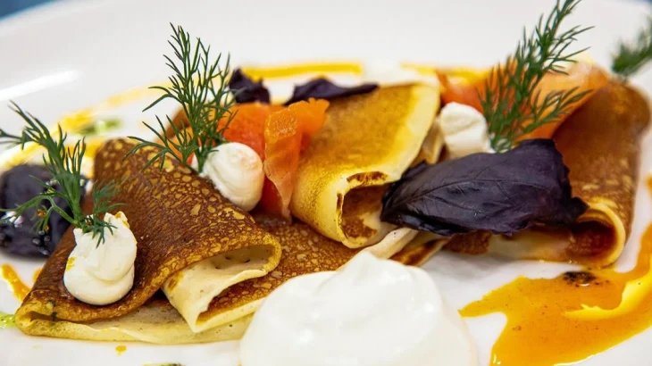 Посетителей приглашают отведать самые разные блины: тонкие, пышные, заварные, с припеком и даже с добавлением шпината. К праздничному угощению можно выбрать любую начинку - как классическую (сметана, творог, вареная сгущенка, слабосоленый лосось и икра), так и необычную (тартар из сельди, томленый гусь с яблоком и клюквенным конфитюром, грибной соус и сморчки, паста из фисташек).
