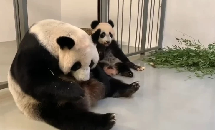 На кадрах медвежонок с усердием поедает ростки бамбука, изредка поглядывая на то, как это делает ее мама Диндин. Сейчас Катюша во всем берет с родительницы пример.