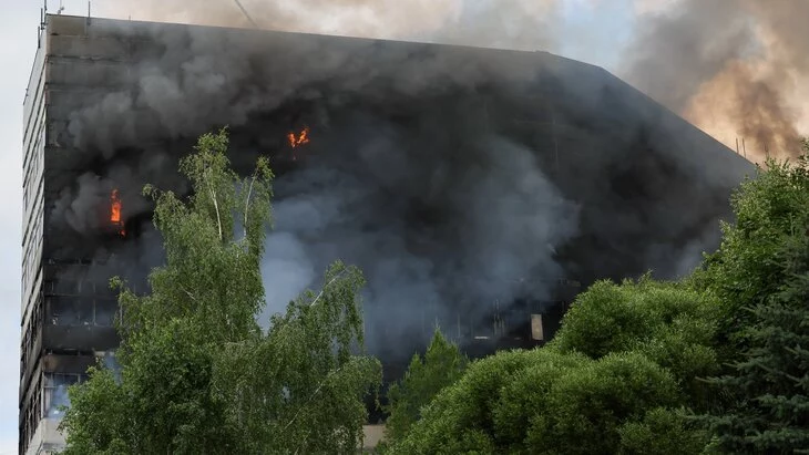 Площадь пожара составляет 5 000 квадратных метров, огонь охватил уже семь этажей – со второго по восьмой.
