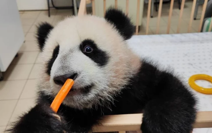 На снимках панда пристально уставилась на что-то. В этот момент она даже забыла о морковке в лапе.