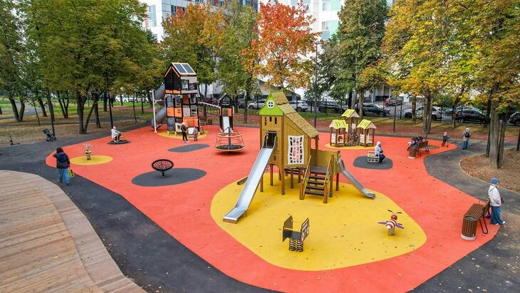 Для юных москвичей специалисты обустроили большую игровую площадку в виде многоуровневых домиков с горками, переходами и элементами, развивающими мелкую моторику. Кроме этого, установили современные качели, карусели и балансиры. Рядом с площадкой находится зона с полосой препятствий, батутом, рукоходами, веревочными и скалолазными элементами.