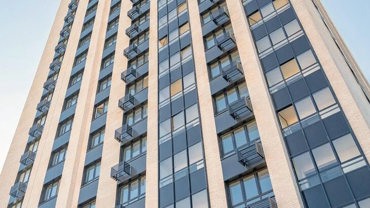 Фасад дома был облицован бетонными плитками с фактурой под кирпич и алюмокомпозитными кассетами в светлых тонах с акцентными серо-коричневыми вставками. Специалисты установили корзины для кондиционеров, а входы оформили витражным остеклением. В самом доме работают четыре лифта грузоподъемностью тысяча и 400 килограммов.