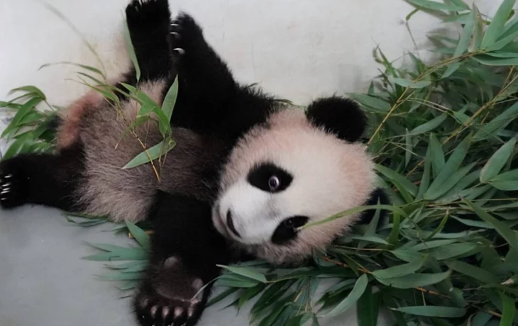 Генеральный директор Московского зоопарка Светлана Акулова поделилась фотографией с лежащей в стеблях сочного бамбука пандой Катюшей.