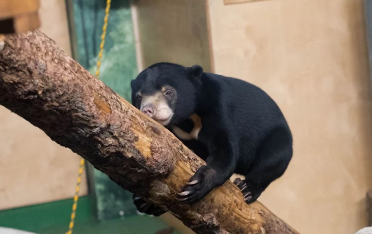Малайские медведи - одни из самых редких видов медведей, отличающиеся косолапостью и характерным желтоватым пятном на груди. Они хорошо лазают по деревьям, не впадают в спячку и питаются насекомыми, фруктами, овощами и медом, передает официальный сайт мэра Москвы.