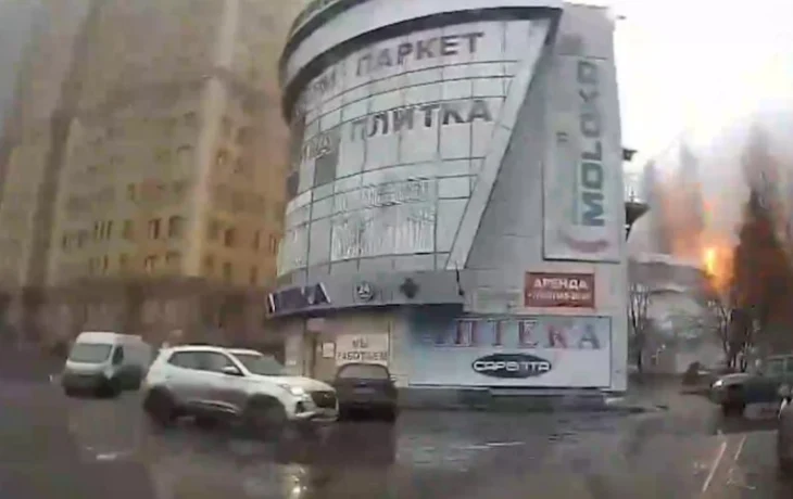 Как только автомобиль подъезжает к супермаркету - в здание попадает ракета, после чего виден сильный взрыв. Когда водитель начинает давать задних ход, по тому же месту прилетает вторая ракета, следует из видео Telegram-канала.