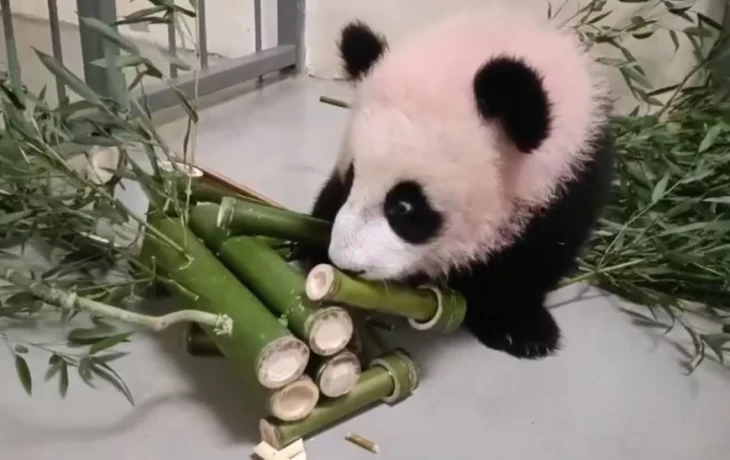 На кадрах видно, как панда сначала осторожно разбирает подаренную ей поделку из бамбука. Спустя некоторое время Катюша решает исследовать ее не только на запах, но и на вкус и принимается грызть палки.