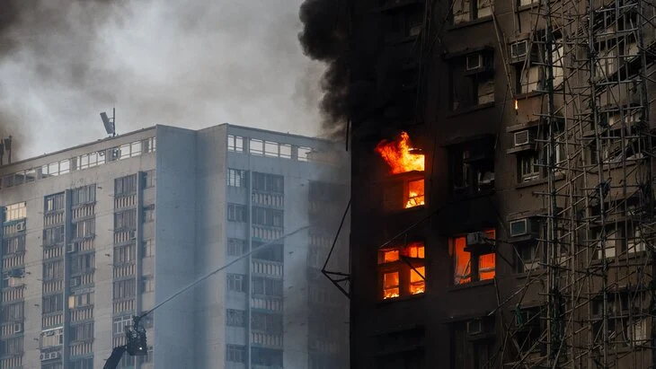 По данным властей, в зоне возгорания могут находиться люди. Причины возникновения огня неизвестны, на месте ЧП работают пожарные и врачи.