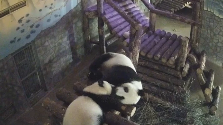 На кадрах мама и дочка отдыхают в экспозиционном вольере павильона. Панды лениво играют друг с другом, обнимаясь и вылизывая мордочки.