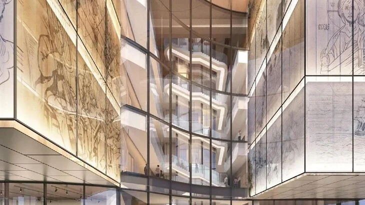 Выбор материалов для оформления фасада музейной части здания был сделан с учетом тематики коллекций. Зал иконы оформят деревом, а зал классической живописи – натуральным камнем. В темное время суток пространство между двумя частями фасада будет освещаться.