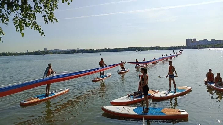 Всего в этом мероприятии, которое прошло в Строгине, приняли участие около 80 человек. Они на сап-бордах развернули флаг РФ над Строгинской поймой. Длина продемонстрированного полотна, равная высоте 50-этажного небоскреба, составила 150 метров.