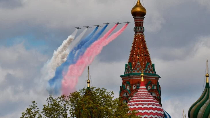 Парад, посвященный 79-й годовщине Победы в Великой Отечественной войне, завершился на Красной площади пролетом авиационных групп высшего пилотажа "Стрижи", "Русские витязи" и штурмовиков с дымами в цветах российского флага.
