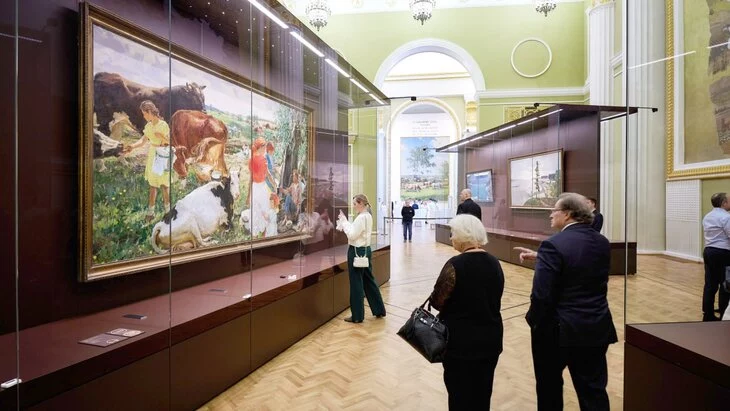 В экспозиции представлены работы Александра Дейнеки, Аркадия Пластова, Александра Герасимова и современных художников. Их произведения были выбраны специально, так как они связаны с историей строительства павильона и тем временным периодом. При этом особое место занимают скульптуры и монументы, включая знаменитую композицию "Рабочий и колхозница" Веры Мухиной, а также мозаика и картины, посвященные труду и патриотизму.