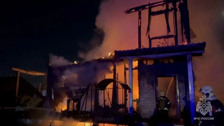 "В СНТ Маяк-Бурцево загорелся 2-этажный частный дом. Произошло обрушение кровли, перекрытий и стен по всей площади. Огонь перекинулся на рядом стоящее здание", – указано в сообщении.