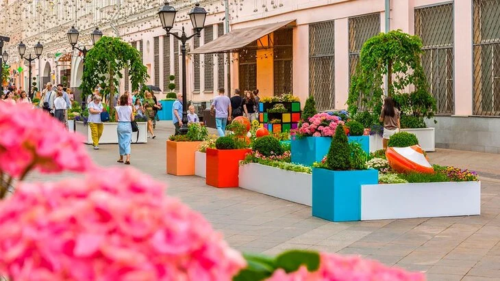Цветочное оформление на улице Рождественка создает среду для отдыха и сочетает природные элементы, символику, форму и цвет.
