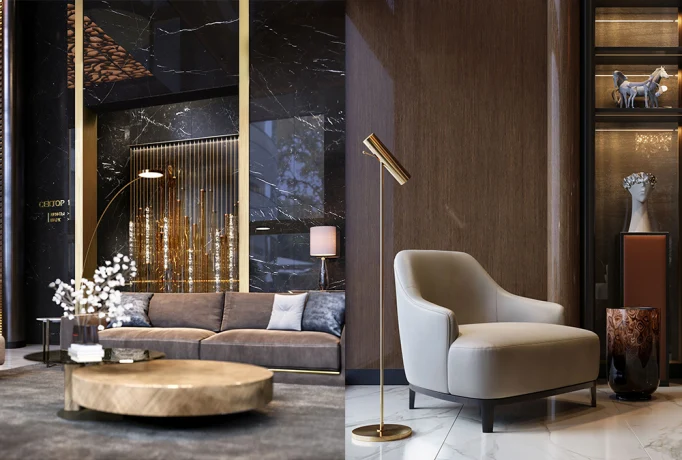 Проект получил название Midas Touch, что в переводе на русский означает «Прикосновение Мидаса» — древнегреческого царя, который мог превращать в золото все, к чему прикасался. Акцентным материалом в отделке лобби стала латунь, а преобладающими оттенками — коричневый и золотой. Такое дизайнерское решение соответствует как трендам 2026 года, так и интерьерной концепции проекта. Глубокие шоколадные оттенки перекликаются с мерцающими золотыми элементами, а авторские арт-объекты подчеркивают индивидуальность пространства.