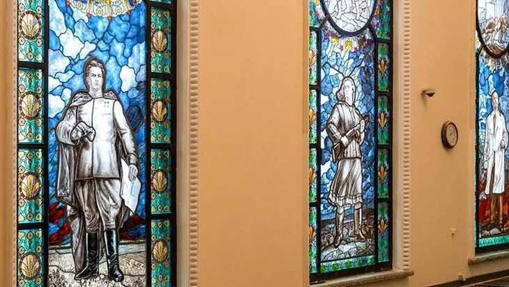 С левой стороны на витраже можно увидеть Винцаса Мицкявичюса-Капсукаса. Он был публицистом, литературным критиком и политическим деятелем.