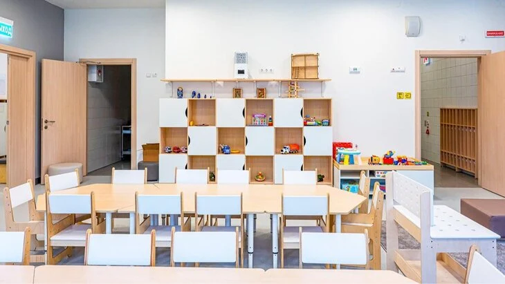 В детском саду есть девять групп для дошкольников всех возрастов. В каждой из них сделали раздевалку, игровую комнату, спальню и буфет. Кроме того, дети смогут посещать физкультурный и музыкальный залы. Предусмотрены кабинеты психолога и логопеда.