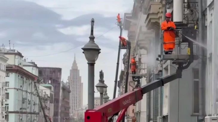 Очистка фасадов домов на Тверской и 1-ой Тверской-Ямской улицах / Видео: Telegram / Городское хозяйство МосквыПроцедура промывки каждого фасада зависит от степени его загрязненности. В частности, здания возле дорог с интенсивным движением очищают по всему периметру, а дома расположенные внутри кварталов, - частично.