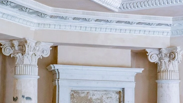 Помимо этого, они убрали вставки из цемента, алебастра, иных ненужных материалов, провели докомпановку утрат, мелких сколов, трещин. Весь сохранившийся лепной декор отреставрировали, обработали укрепляющими и антигрибковыми составами, нанесли грунтовку, затем он будет покрашен.
