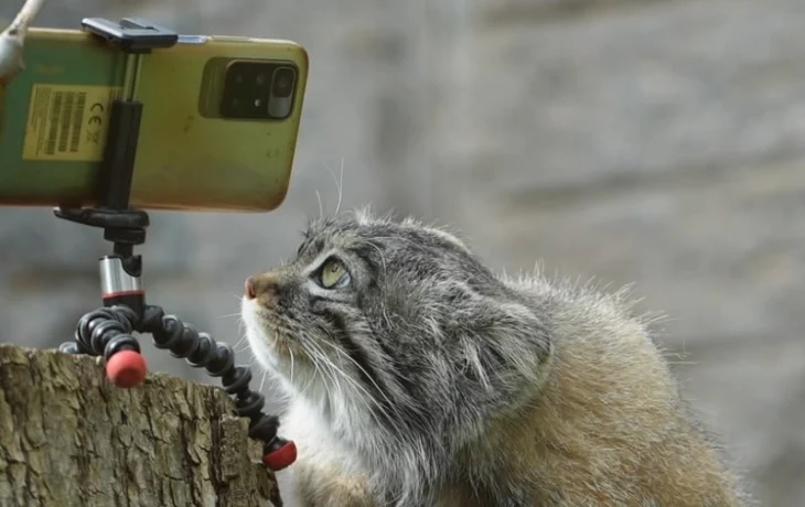 На снимке палласов кот с интересом изучает смартфон на штативе, который принадлежит киперу по имени Денис. Видимо, Тимоша крайне заинтересован в освоении новых гаджетов.