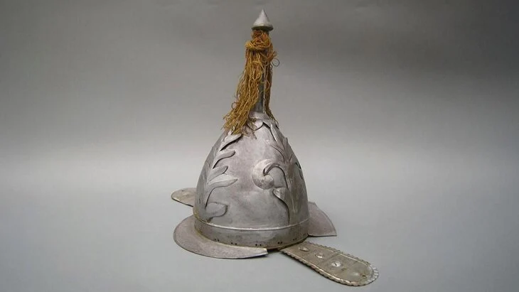 Шлем выполнен из тонкой белой жести и напоминает головные уборы античных воинов. Также его украшают накладные пластины с растительным орнаментом, а на лобной и шейной частях имеются съемные наушники и козырьки. Завершает конструкцию заостренный шпиль, украшенный шерстяными нитями. Шлем достаточно легкий и предназначен для небольшой головы.