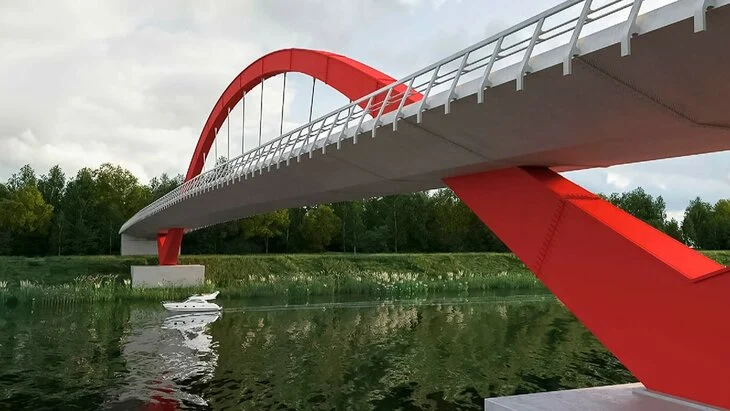 Протяженность сооружения составит около 200 метров, а ширина – почти 12 метров. Мост будет выполнен в серых оттенках с красными конструктивными акцентами.