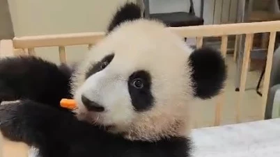 На опубликованном видео медвежонок сидит в своей кроватке и усердно пытается «победить» морковку, с жеванием которой у детеныша панды проблемы. Катюша пробует есть ее сидя, лежа и даже держась за бортик кроватки.