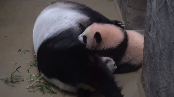 На видео большие панды лежат в экспозиционном вольере возле прохода. Это единственное место, куда маме пока удалось вывести малышку. Не обошлось и без убедительной для того причины - кормления. Катюша находится рядом со своей родительницей и пьет ее грудное молоко.