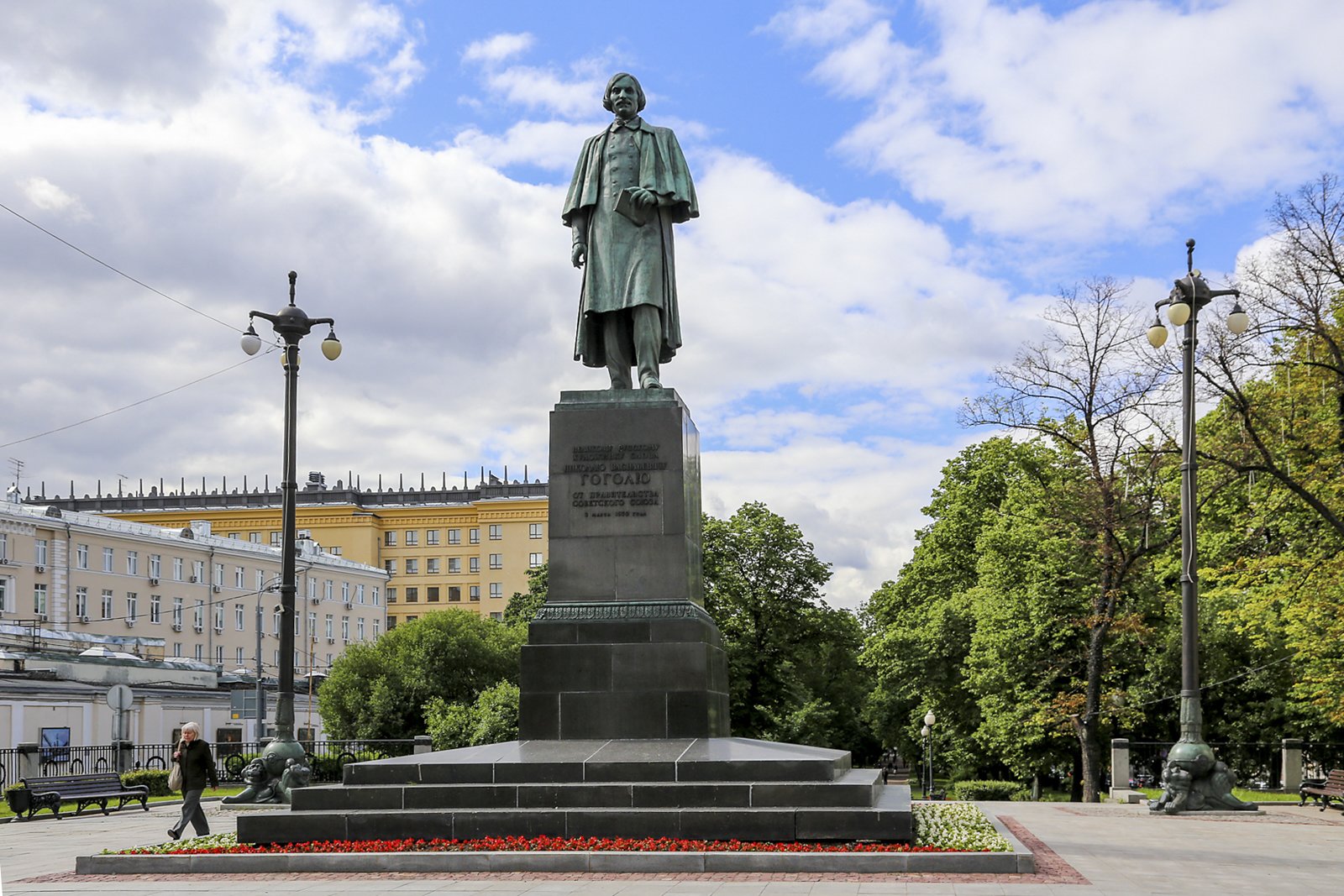 В 1909 году, к 100-летию со дня рождения Гоголя, недалеко от дома № 7а по Никитскому бульвару, где прошли последние четыре года жизни писателя, и где за десять дней до его смерти в камине сгорел второй том «Мертвых душ», на Перичтенском бульваре писателю поставили памятник работы Николая Андреева. Гоголь на нем изображен сидящим в расслабленной позе и печально смотрящим вниз. А внизу на постаменте барельефные изображения его персонажей. Готовили памятник почти тридцать лет: в 1880 году было принято решение о его установке в Москве, а потом долго собирали деньги, разрабатывали проект, потом Николай Андреев работал над образом Гоголя – в общем понадобилось на это 29 лет. А в 1952-м году, к 100-летию смерти, Андреевского Гоголя оттуда убрали, потому что советское руководство посчитало, что памятник недостаточно оптимистичен и отправили его в Донской монастырь, где в то время был музей скульптуры. А на Гоголевском бульваре поставили памятник работы Томского, на котором писатель бодрый и довольно ординарный.