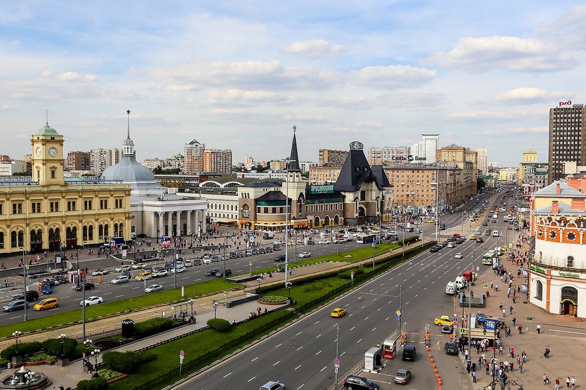 После Николаевского вокзала здесь появился Ярославский, или, как его тогда называли, вокзал Троицкой железной дороги, ибо путь протянули сначала только до Сергиева Посада, где находилась Троицкая лавра. Первоначально предполагалось выстроить вокзал на 1-й Мещанской, на месте университетского Ботанического сада, но университет не согласился отдать его, и тогда решили сосредоточить несколько вокзалов в одном месте. Новый вокзал Троицкой дороги был небольшим и невидным зданием. Но в связи с тем, что позднее дорога достигла Архангельска и соединила Москву с огромными территориями Русского Севера, которому многие, и в их числе владелец дороги Савва Мамонтов, предрекали большую будущность, вокзал, вернее его фасадную часть, перестроили полностью. Автором этого весьма необычного и по сегодняшним меркам здания, построенного в 1902-1904 гг. был Ф.О. Шехтель. Главный акцент – на входе в вокзал, напоминающем открытые крепостные ворота в нижнем ярусе могучей башни. На здании вокзала помещены лепные гербы Москвы, Ярославля и Архангельска.