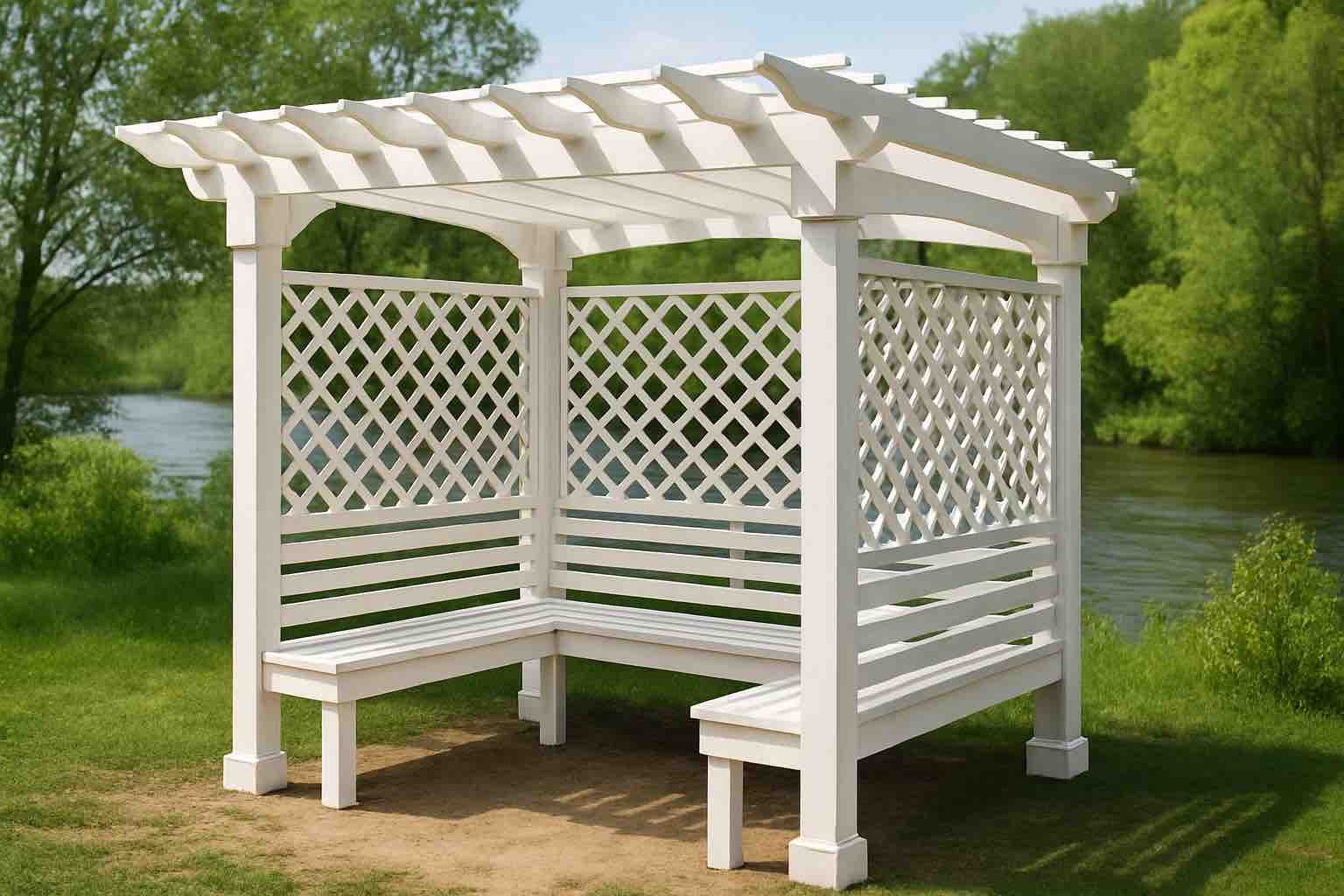Легкие конструкции без стен или с частичным ограждением. Подходят для летнего отдыха, хорошо проветриваются и не задерживают солнечный свет. Часто дополняются вьющимися растениями.