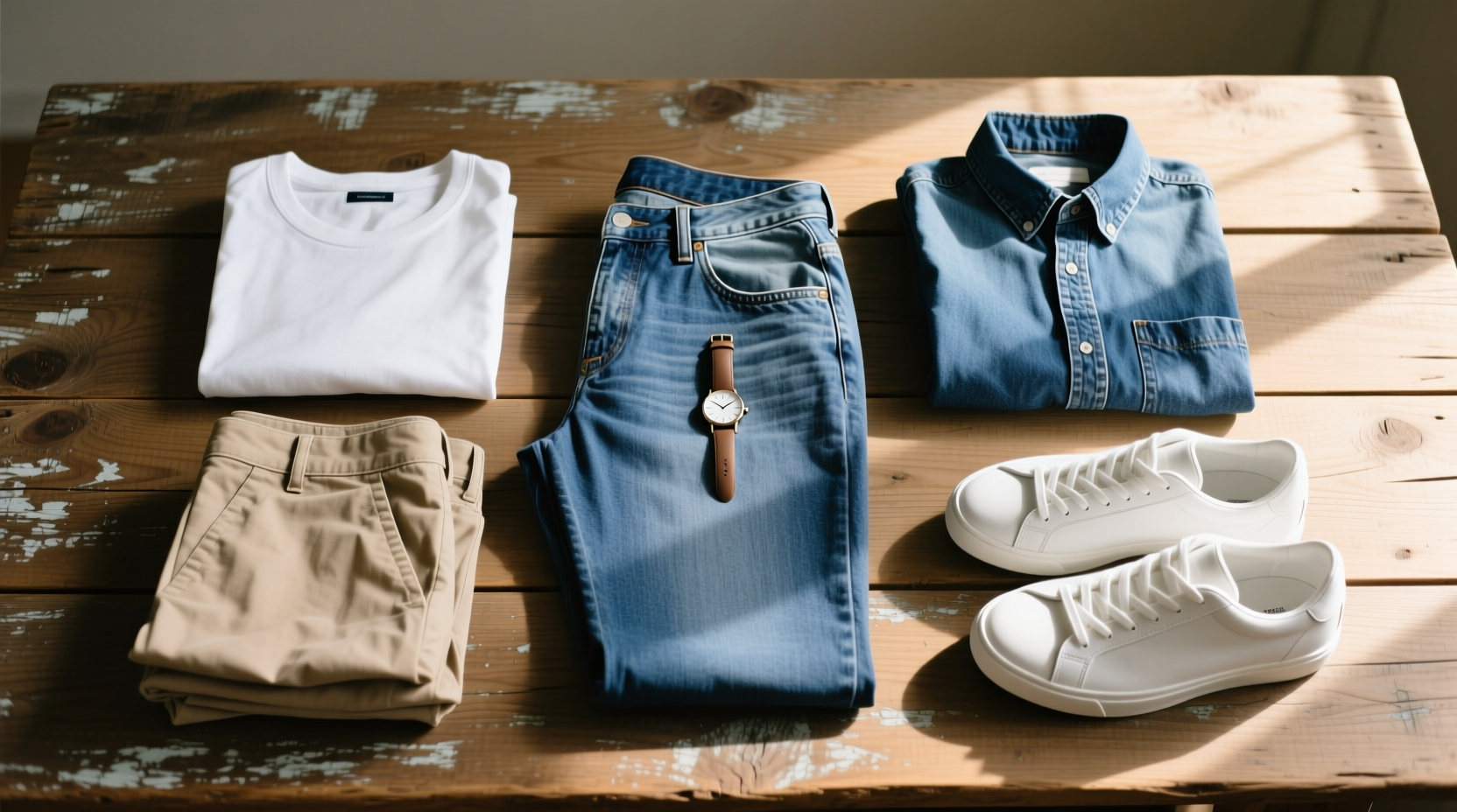Эти вещи можно комбинировать десятками способов, добавляя аксессуары или яркие детали. Например, белая футболка с джинсами — минимальный образ, но если надеть поверх джинсовую рубашку и добавить лоферы, получится smart casual.