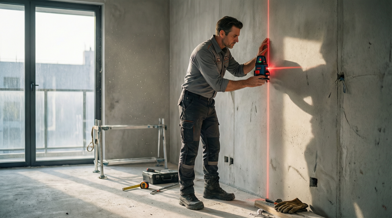 - геометрию помещений — отклонения стен, полов и потолков от вертикали и горизонтали с точностью ±0,2 мм/м с помощью лазерных нивелиров BOSCH;