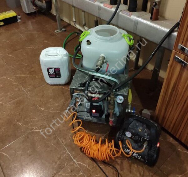 - Подготовка оборудования. Для промывки используются компрессор, насос, шланги и фильтры для сбора загрязнений.