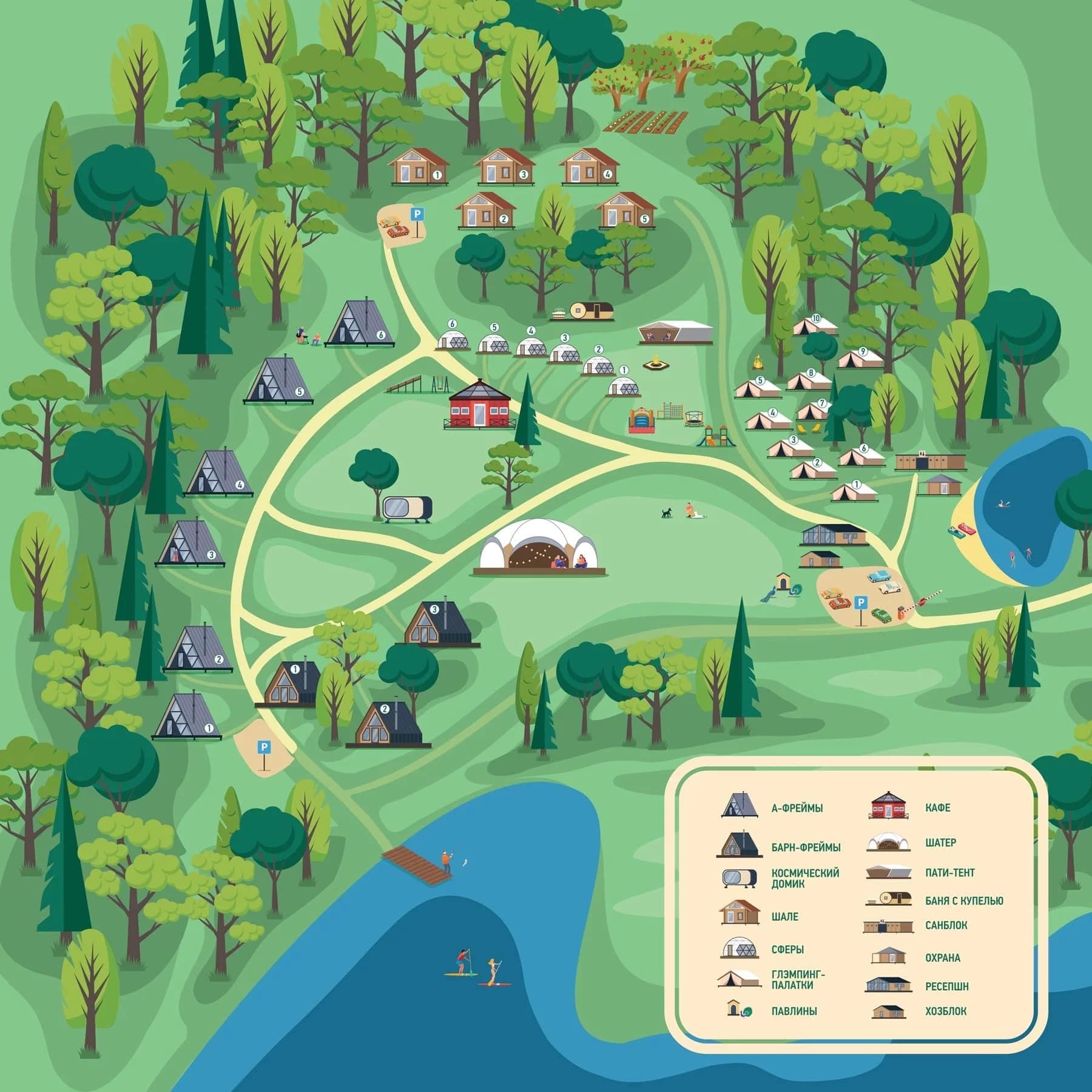 Оригинальные концепции и дизайн —размещение включает уникальные домики и палатки, сочетающие в себе комфорт и эстетическую привлекательность.