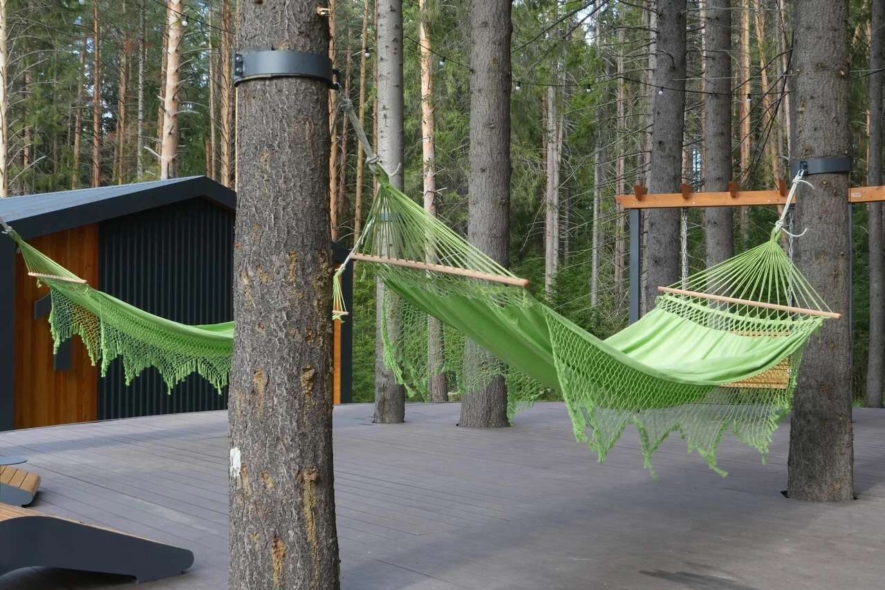 Отдельное внимание уделено местам для релаксации. По всей территории расставлены шезлонги, гамаки и подвесные скамейки-коконы, где можно уединиться с книгой, просто помечтать под шум листвы или наблюдать за природой. Такие уголки становятся любимым местом для тех, кто хочет отключиться от городского стресса и насладиться моментом покоя.