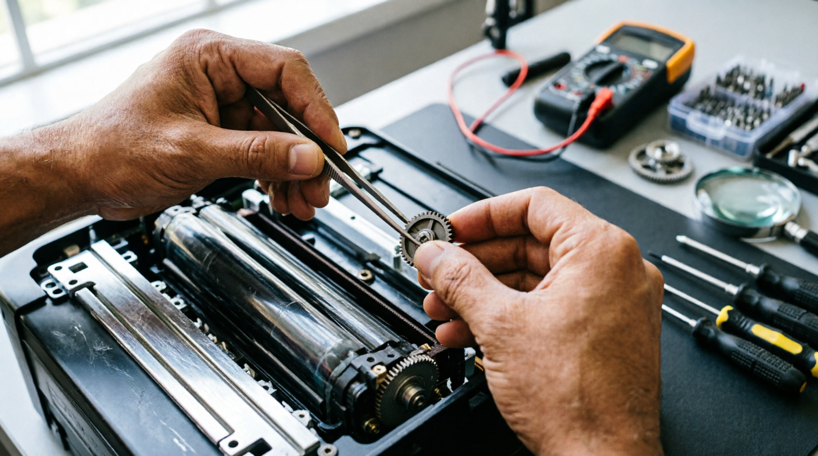 Процесс восстановления оргтехники включает несколько последовательных стадий. Сначала оборудование проходит полную разборку и очистку от тонера, бумажной пыли и других загрязнений. Затем проводится дефектовка — визуальный и инструментальный контроль каждого узла. На третьем этапе заменяются изношенные детали оригинальными или сертифицированными аналогами.