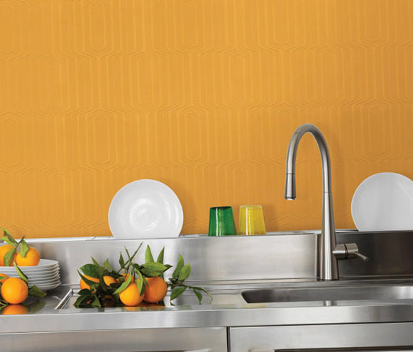 Эти обои подойдут для любителей однотонной отделки стен. Такое покрытие обладает высокой плотностью, не выгорает на солнце и вообще служит достаточно долго: стены можно будет спокойно царапать, шоркать щеткой и тереть влажной тряпкой. Виниловые обои также лучше всего скрывают все неровности и шероховатости стен. Существуют особые разновидности, которые также обладают дезинфицирующими и бактерицидными свойствами, препятствуя появлению и размножению плесени и грибков. Согласитесь, для кухни это просто идеальный вариант?