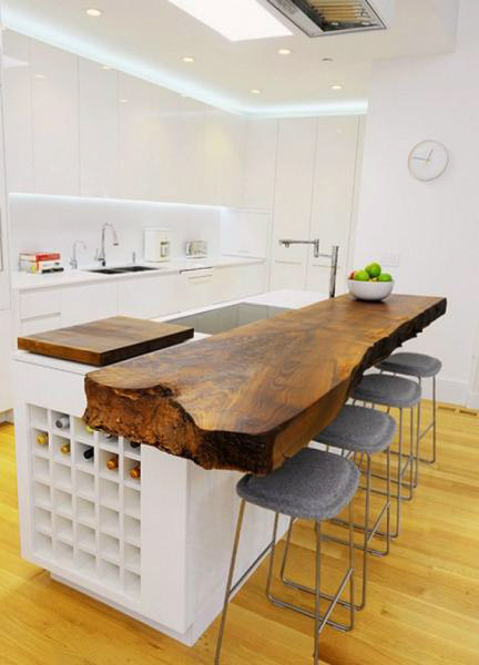 Если же площадь вашей кухни позволяет проводить интересные эксперименты, то обязательно предлагаем вам воплотить в жизнь эту идею. Барная столешница в виде отдельно стоящего «островка» в самом центре кухни станет главной фишкой вашего интерьера и будет привлекать всеобщее внимание. Вдобавок вы будете иметь доступ к столу со всех сторон, что очень удобно как при приготовлении блюд, так и во время вечерних застолий.