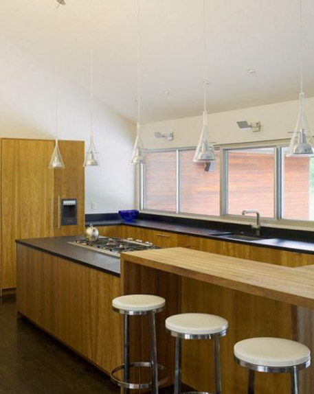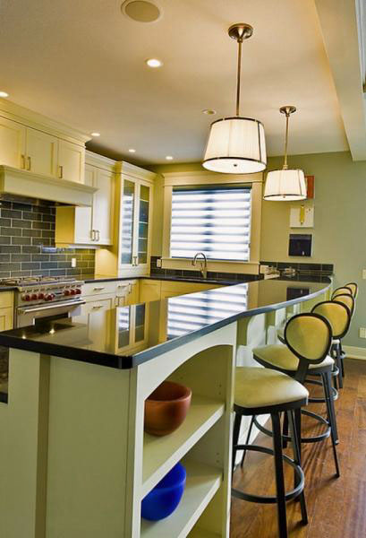 Место над кухонным столом, как правило, занято огромной люстрой или не используется вовсе. В случае с барной стойкой имеется множество вариантов выгодно и интересно использовать свободное пространство.