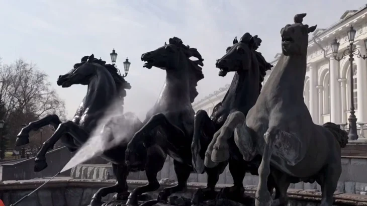 Очистка фонтанного комплекса на Манежной площади в центре Москвы / Видео: Telegram / Городское хозяйство МосквыФонтанный комплекс подготовит бригада из четырех человек, которые задействуют поливомоечную технику. Они очистят сооружения от загрязнений, после чего тщательно промоют моющим средством чаши, парапеты и наружные инженерные коммуникации. Специалисты отдельно промоют скульптуры коней фонтана «Гейзер». Перед этим они вручную очистят декоративные детали мягкими кистями с применением специального средства.