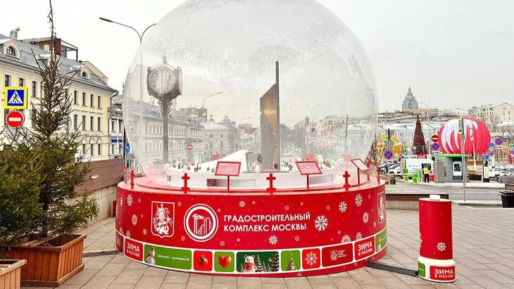 Инсталляция была установлена в рамках проекта "Зима в Москве". Внутри шара расположен макет Национального космического центра, построенного в 2025 году.