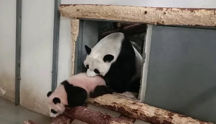 На кадрах видно, как большая панда берет своего медвежонка в зубки и переносит в экспозиционный вольер. Однако надолго задержать Катюшу в непривычном месте обитания не выходит. Она снова возвращается по деревянной лестнице в маленький вольер, несмотря на попытки Диндин вернуть дочь.