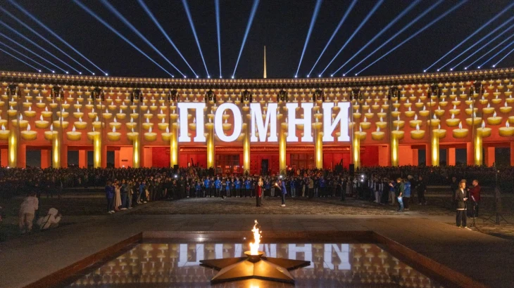 Одновременно на фасаде главного здания Музея Победы благодаря технологии видеомэппинга вспыхнула масштабная видеоинсталляция площадью почти три тысячи квадратных метров - 1418 частиц Вечного огня по числу дней войны и слово «Помни», а небо столицы озарили «Лучи Победы». Собравшиеся почтили память погибших минутой молчания.