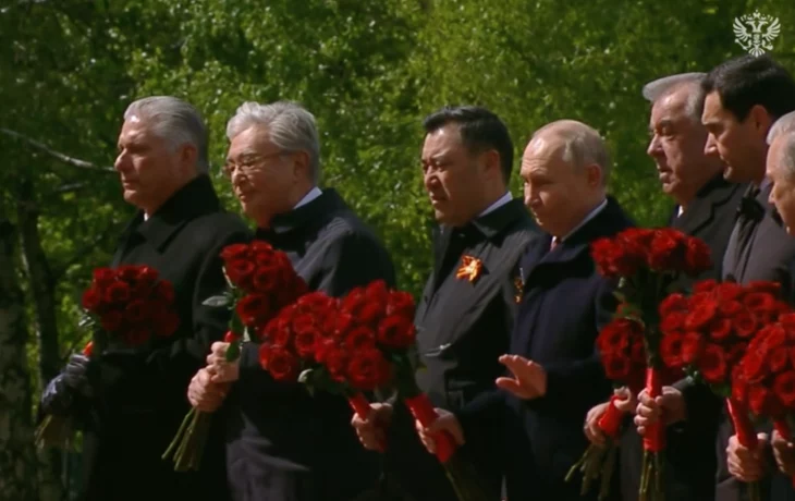 Владимир Путин вместе с главами иностранных государств возложил цветы к Могиле Неизвестного Солдата. / Видео: Кремль. Новости / TelegramРоссийский лидер ранее встретил глав государств, которые приехали на парад Победы в Москву.