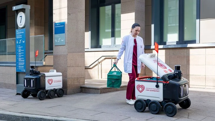 Роботы перемещаются между больничными корпусами, доставляя биоматериалы и расходники в лаборатории, а также лекарства из аптек, находящихся на территории медучреждения, в отделения. Они самостоятельно прокладывают маршруты, избегают препятствия и обеспечивают сохранность груза в любых погодных условиях.