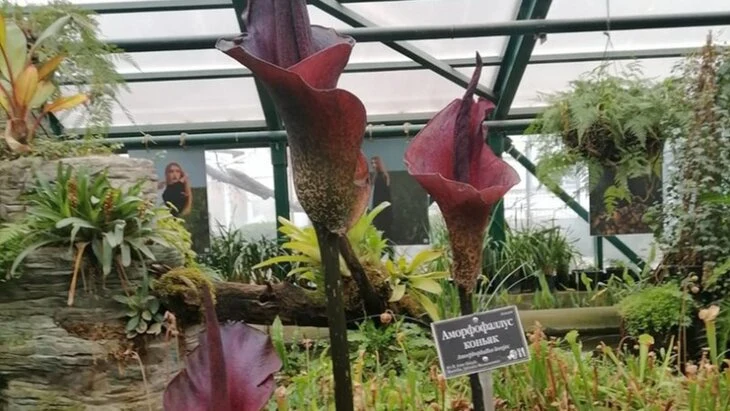 Язык дьявола, также известный как аморфофаллус коньяк и трупный цветок, расцвел в Субтропической оранжерее ботанического сада МГУ "Аптекарский огород". Об этом сообщила пресс-служба сада в MAX.