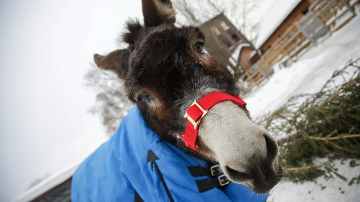 Жорика поселили на новой территории в детском зоопарке. Осел адаптировался к столичной зиме и спокойно переносит морозы. В первой половине дня он гуляет, а в остальное время находится в вольере.